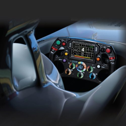 - Volante con acabado de fibra de carbono, pantalla alfanumérica integrada y cierre rápido. El motor de transmisión directa ofrece retroalimentación de la fuerza de dirección con un par de hasta 5 Nm.